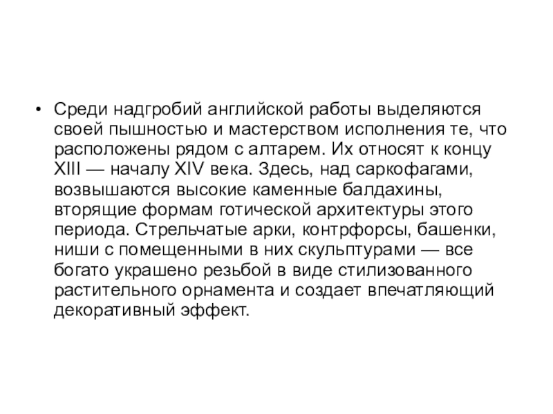 что расположены рядом с алтарем. Их относят к концу XIII — началу XIV века. Здесь, над саркофагами, возвышаются высокие каменные балдахины, вторящие формам готической архитектуры этого периода. Стрельчатые арки, контрфорсы, башенки, ниши с помещенными в них скульптурами — все богато украшено резьбой в виде стилизованного растительного орнамента и создает впечатляющий декоративный эффект.