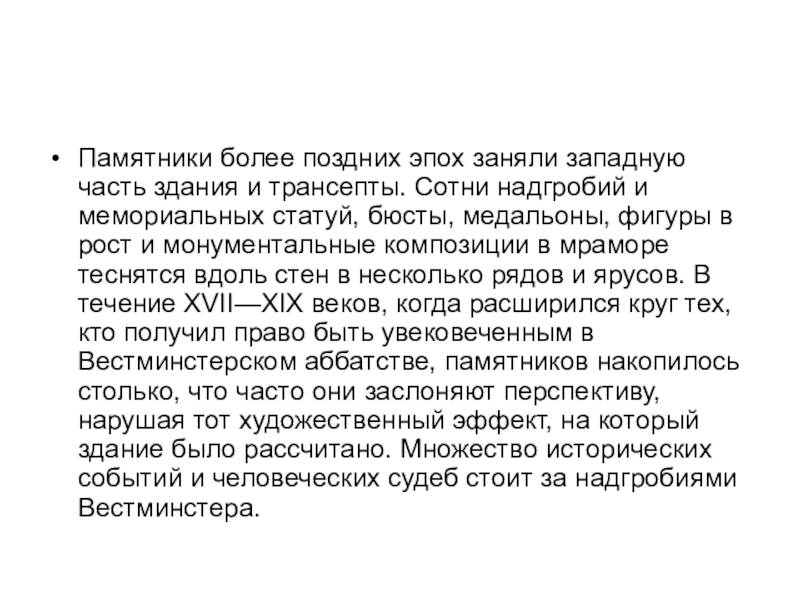 надгробий и мемориальных статуй, бюсты, медальоны, фигуры в рост и монументальные композиции в мраморе теснятся вдоль стен в несколько рядов и ярусов. В течение XVII—XIX веков, когда расширился круг тех, кто получил право быть увековеченным в Вестминстерском аббатстве, памятников накопилось столько, что часто они заслоняют перспективу, нарушая тот художественный эффект, на который здание было рассчитано. Множество исторических событий и человеческих судеб стоит за надгробиями Вестминстера.