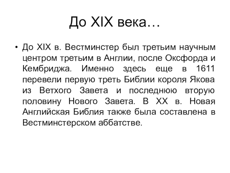 в Англии, после Оксфорда и Кембриджа. Именно здесь еще в 1611 перевели первую треть Библии короля Якова из Ветхого Завета и последнюю вторую половину Нового Завета. В ХХ в. Новая Английская Библия также была составлена в Вестминстерском аббатстве.