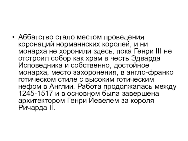хоронили здесь, пока Генри III не отстроил собор как храм в честь Эдварда Исповедника и собственно, достойное монарха, место захоронения, в англо-франко готическом стиле с высоким готическим нефом в Англии. Работа продолжалась между 1245-1517 и в основном была завершена архитектором Генри Йевелем за короля Ричарда II.