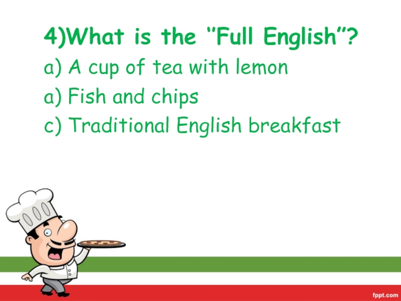 4)What is the ‘’Full English”?a) A cup of tea with lemona) Fish and chipsc) Traditional English breakfast