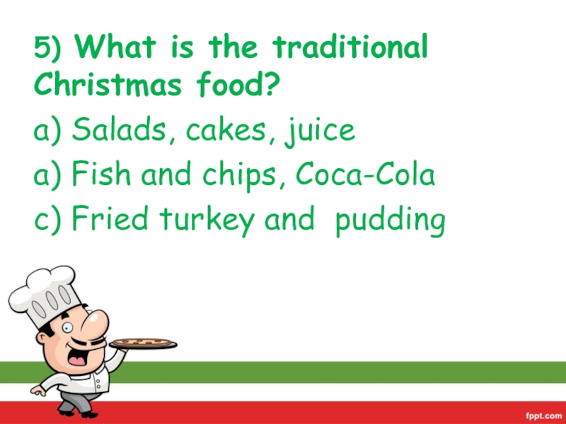 5) What is the traditional Christmas food?a) Salads, cakes, juicea) Fish and chips, Coca-Colac) Fried turkey and