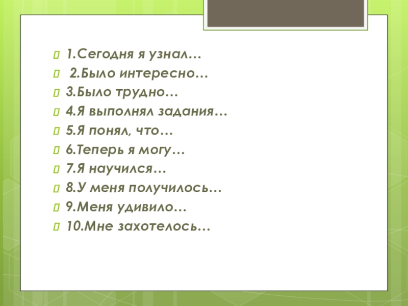 1.Сегодня я узнал… 2.Было интересно…3.Было трудно… 4.Я выполнял задания…5.Я понял, что… 6.Теперь я могу…7.Я научился… 8.У меня получилось…9.Меня удивило… 10.Мне захотелось…