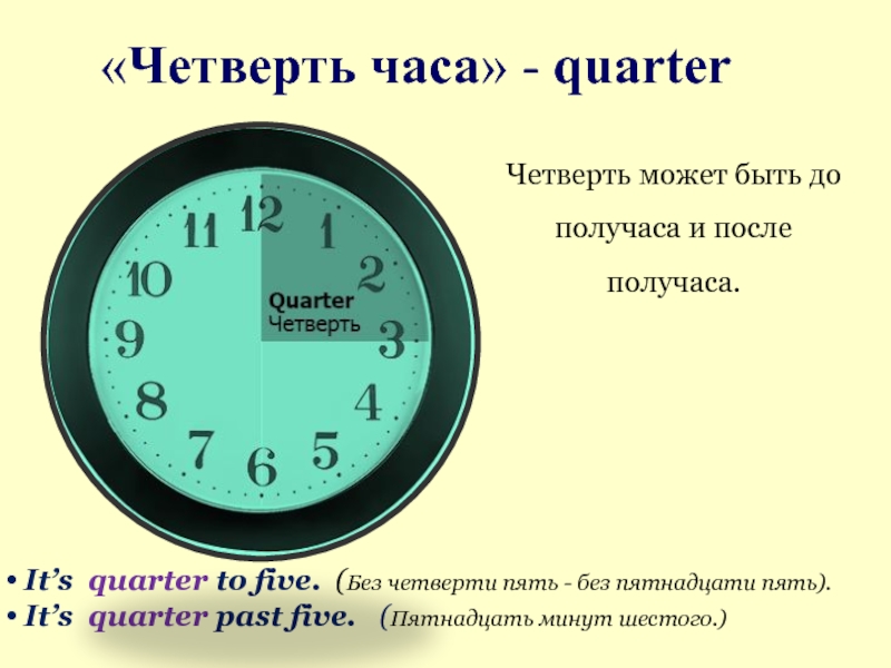 It’s quarter past five. (Пятнадцать минут шестого.)