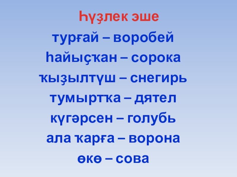 Һүҙлек эшетурғай – воробейһайыҫҡан – сорокаҡыҙылтүш – снегирьтумыртҡа – дятелкүгәрсен – голубьала ҡарға – воронаөкө – сова