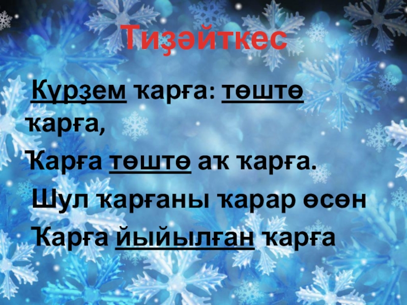 Тиҙәйткес Күрҙем ҡарға: төштө ҡарға,Ҡарға төштө аҡ ҡарға. Шул ҡарғаны ҡарар өсөн Ҡарға йыйылған ҡарға