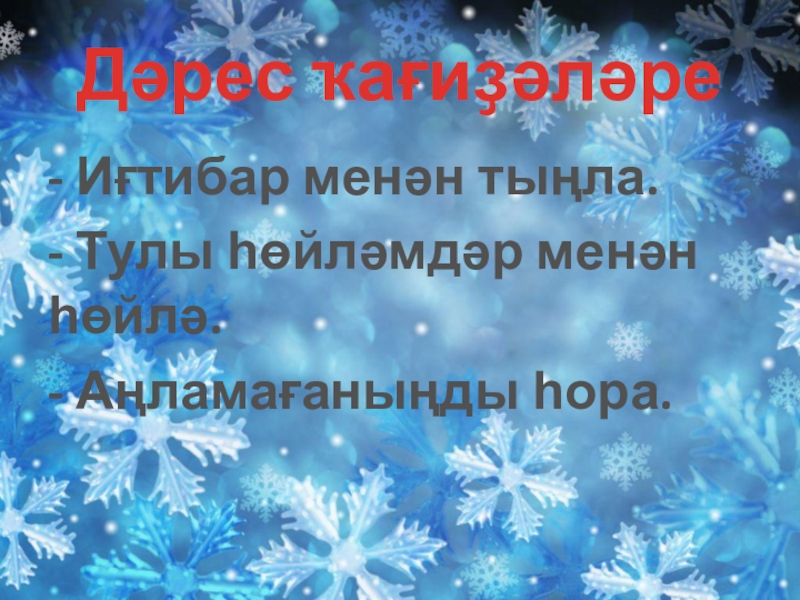 Дәрес ҡағиҙәләре- Иғтибар менән тыңла.- Тулы һөйләмдәр менән һөйлә.- Аңламағаныңды һора.