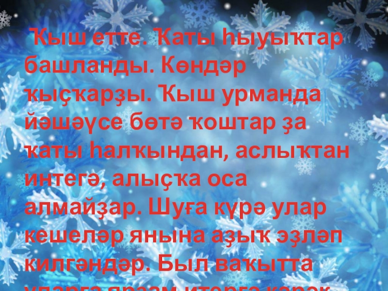 Слайд 22 Ҡыш етте. Ҡаты һыуыҡтар башланды. Көндәр ҡыҫҡарҙы. Ҡыш урманда йәшәүсе