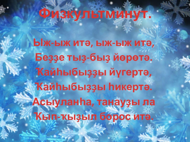 Физкультминут.Ыж-ыж итә, ыж-ыж итә,Беҙҙе тыҙ-быҙ йөрөтә.Ҡайһыбыҙҙы йүгертә,Ҡайһыбыҙҙы һикертә.Асыуланһа, танауҙы лаҠып-ҡыҙыл борос итә.