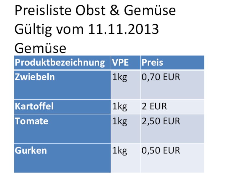 Preisliste Obst & GemüseGültig vom 11.11.2013Gemüse