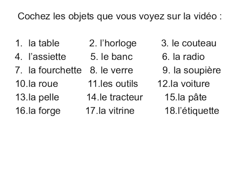 Слайд 5 Cochez les objets que vous voyez sur la vidéo :