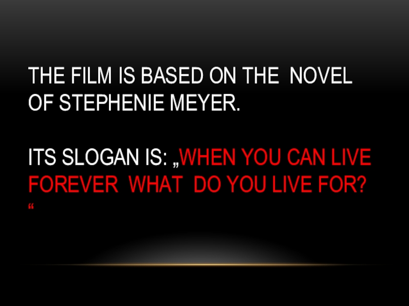 Слайд 29The film is based on the novel of stephenie meyer. Its