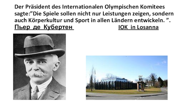 Leistungen zeigen, sondern auch Körperkultur und Sport in allen Ländern entwickeln. ”. Пьер де Кубертен IOK in Losanna