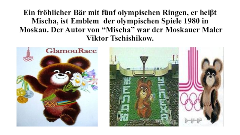 Слайд 2Ein fröhlicher Bär mit fünf olympischen Ringen, er heiβt Mischa, ist