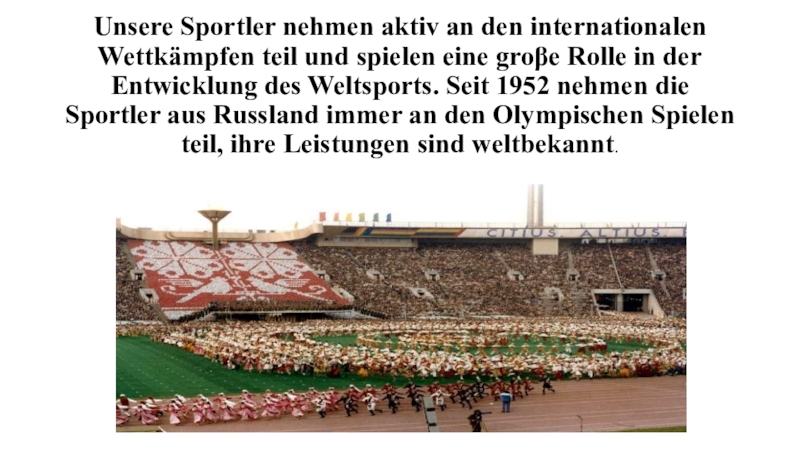 eine groβe Rolle in der Entwicklung des Weltsports. Seit 1952 nehmen die Sportler aus Russland immer an den Olympischen Spielen teil, ihre Leistungen sind weltbekannt.