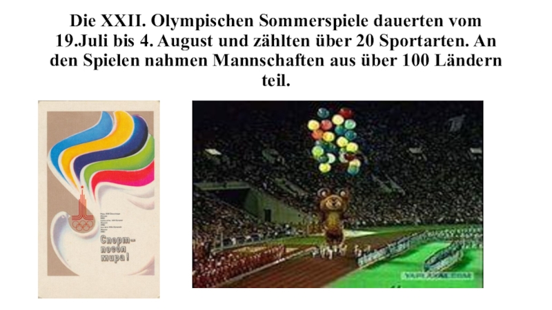 Слайд 9Die XXII. Olympischen Sommerspiele dauerten vom 19.Juli bis 4. August und