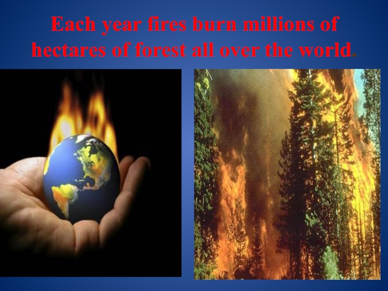 Слайд 12Each year fires burn millions of hectares of forest all over