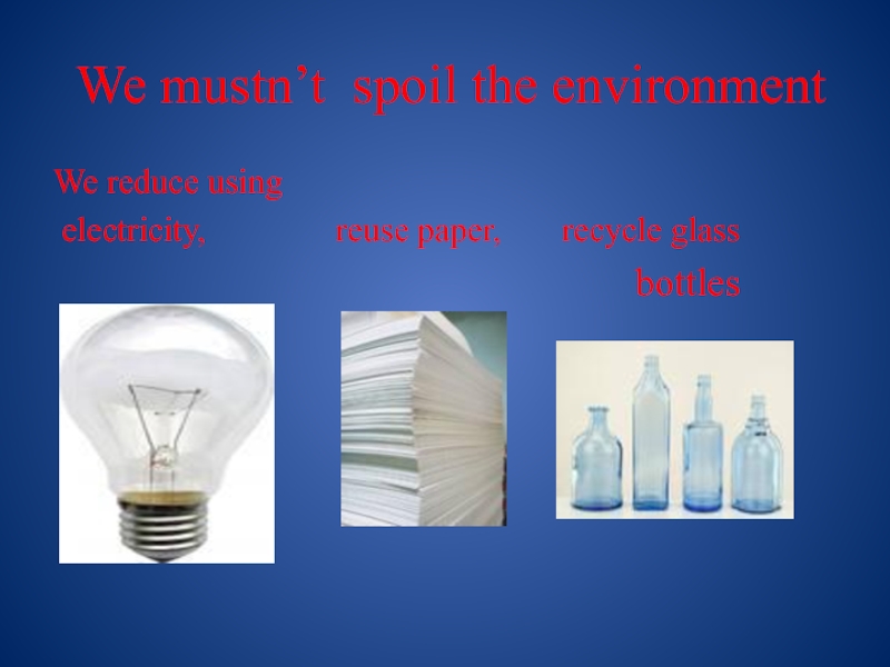 We mustn’t spoil the environmentWe reduce using electricity,        reuse
