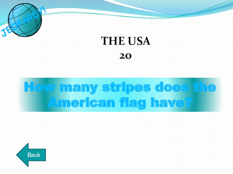 How many stripes does the American flag have?THE USA20BackJEOPARDY!