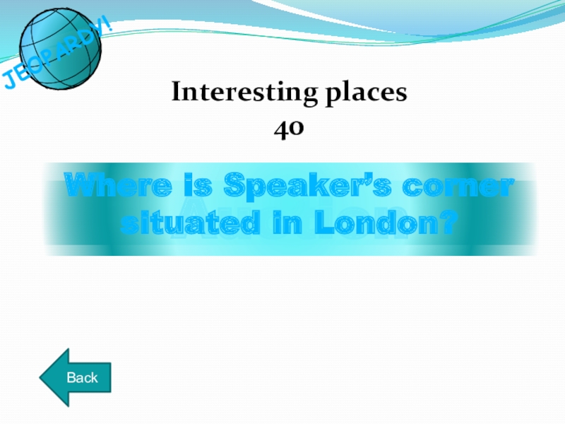 AuctionBackInteresting places40Where is Speaker’s cornersituated in London?JEOPARDY!