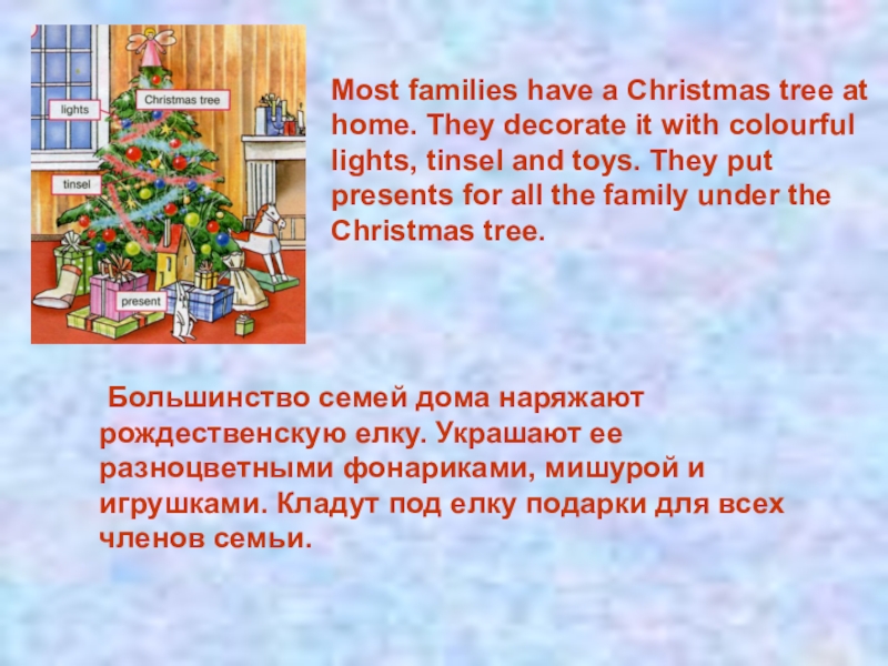 разноцветными фонариками, мишурой и игрушками. Кладут под елку подарки для всех членов семьи.