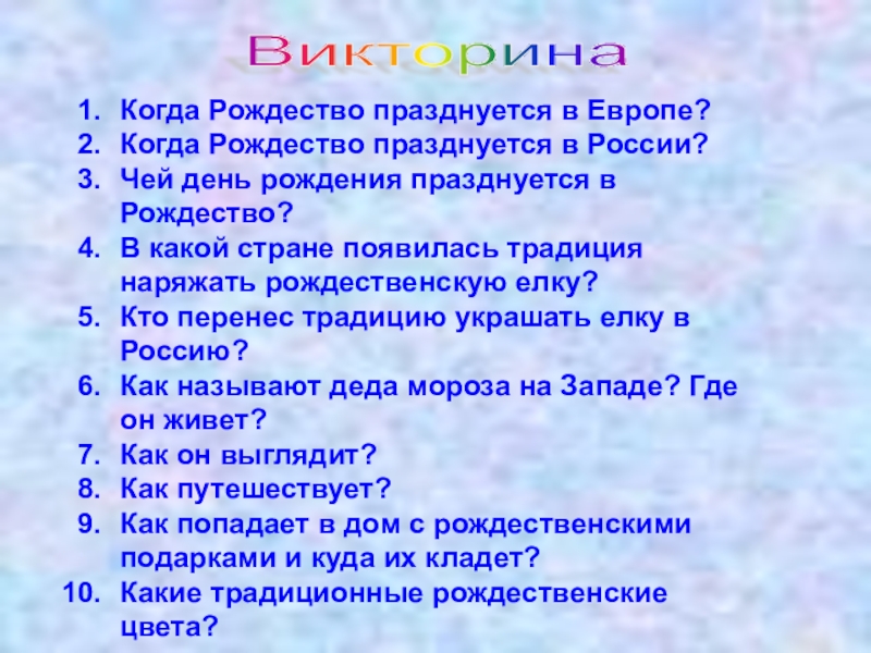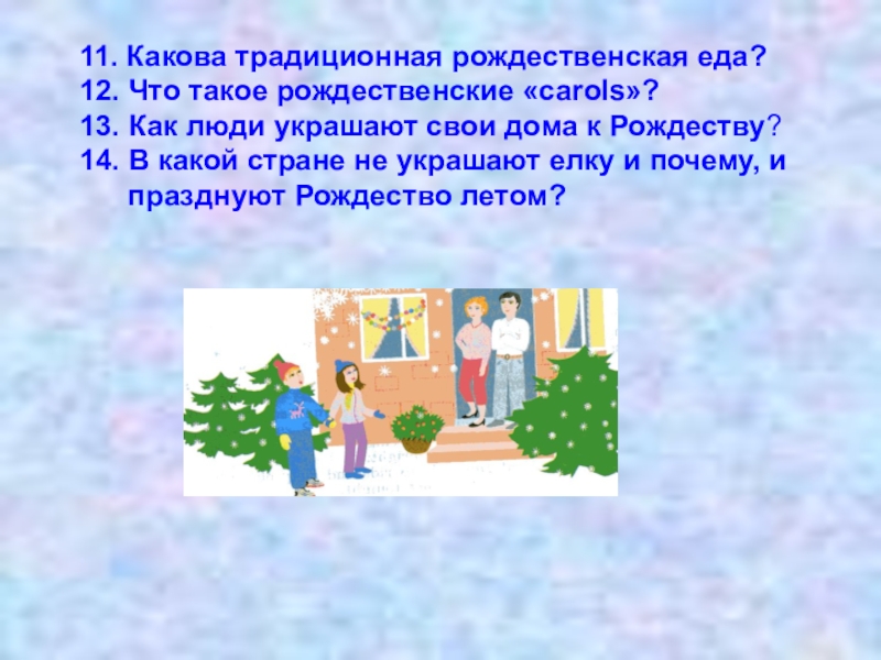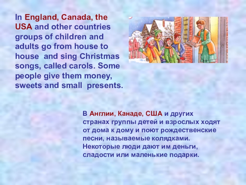 В Англии, Канаде, США и других странах группы детей и взрослых ходят от дома к дому и поют рождественские песни, называемые колядками. Некоторые люди дают им деньги, сладости или маленькие подарки.