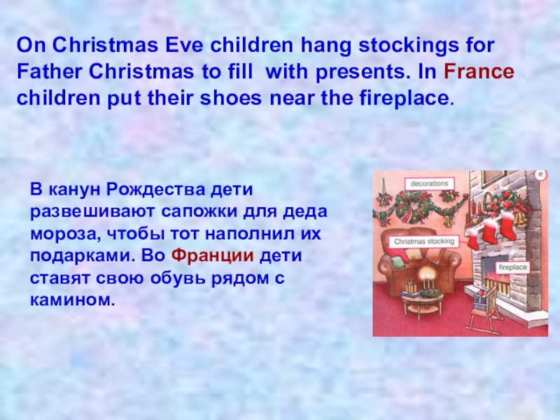 В канун Рождества дети развешивают сапожки для деда мороза, чтобы тот наполнил их подарками. Во Франции дети ставят свою обувь рядом с камином.