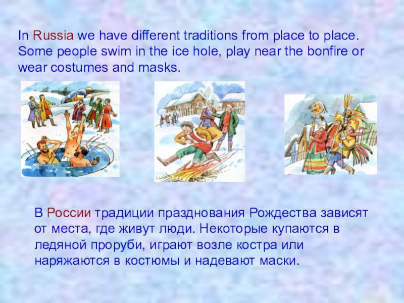 В России традиции празднования Рождества зависят от места, где живут люди. Некоторые купаются в ледяной проруби, играют возле костра или наряжаются в костюмы и надевают маски.