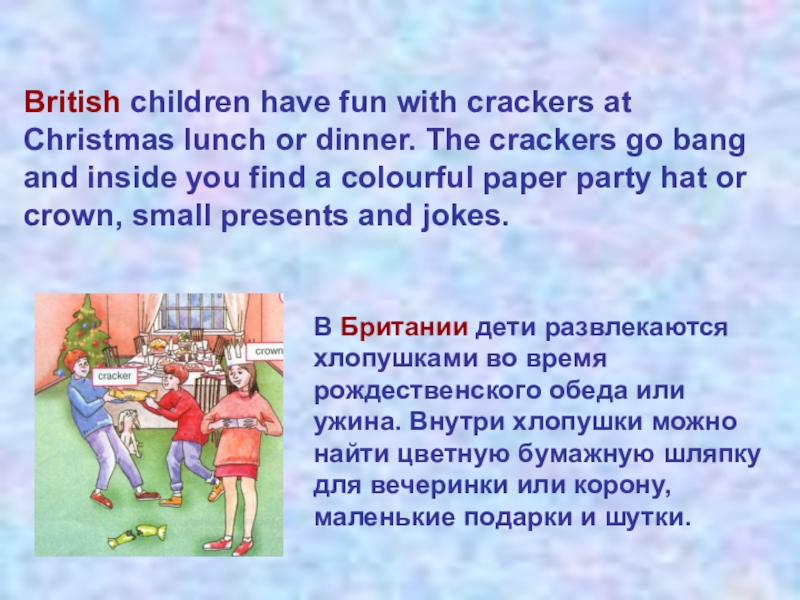 хлопушками во время рождественского обеда или ужина. Внутри хлопушки можно найти цветную бумажную шляпку для вечеринки или корону, маленькие подарки и шутки.