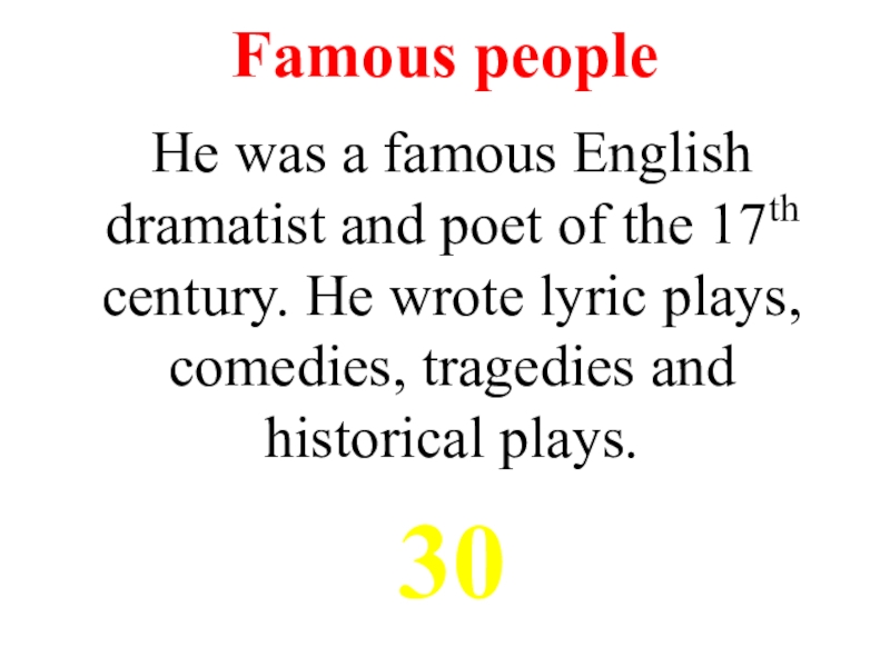 Famous peopleHe was a famous English dramatist and poet of the 17th century. He wrote lyric plays,
