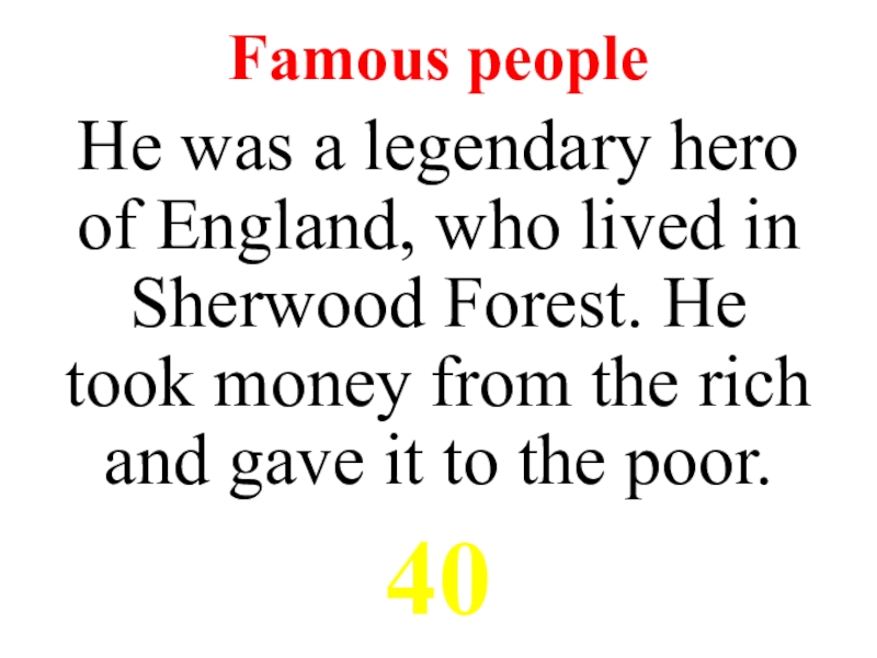 Famous peopleHe was a legendary hero of England, who lived in Sherwood Forest. He took money from