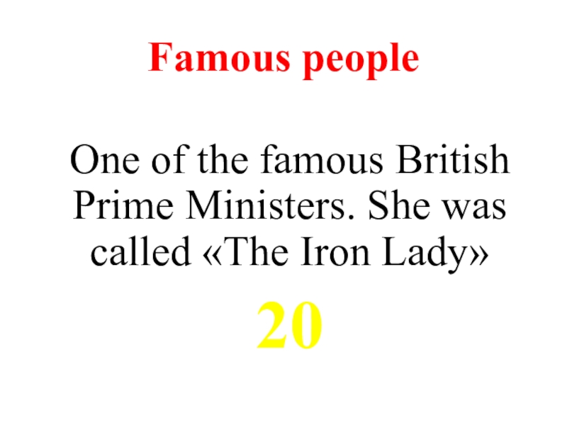 Famous peopleOne of the famous British Prime Ministers. She was called «The Iron Lady»20