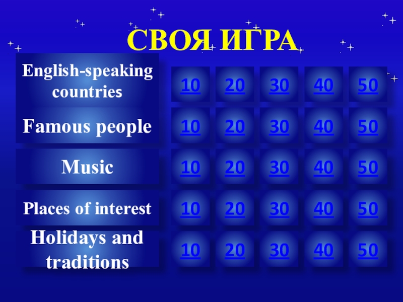 10203040501020304050102030405010203040501020304050English-speaking countries Famous peopleMusic Places of interestHolidays and traditions СВОЯ ИГРА