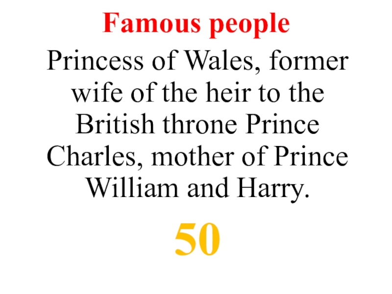 Famous peoplePrincess of Wales, former wife of the heir to the British throne Prince Charles, mother of