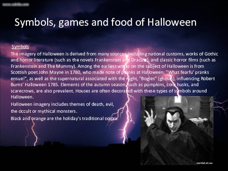 national customs, works of Gothic and horror literature (such as the novels Frankenstein and Dracula), and classic horror films (such as Frankenstein and The Mummy). Among the earliest works on the subject of Halloween is from Scottish poet John Mayne in 1780, who made note of pranks at Halloween; "What fearfu' pranks ensue!", as well as the supernatural associated with the night, "Bogies" (ghosts), influencing Robert Burns' Halloween 1785. Elements of the autumn season, such as pumpkins, corn husks, and scarecrows, are also prevalent. Houses are often decorated with these types of symbols around Halloween.