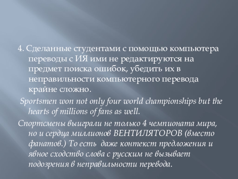 Спортсмены выиграли не только 4 чемпионата мира, но и сердца миллионов ВЕНТИЛЯТОРОВ (вместо фанатов.) То есть даже контекст предложения и явное сходство слова с русским не вызывает подозрения в неправильности перевода.