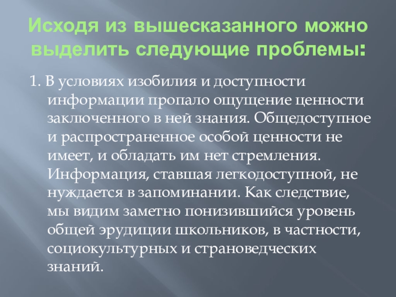 доступности информации пропало ощущение ценности заключенного в ней знания. Общедоступное и распространенное особой ценности не имеет, и обладать им нет стремления. Информация, ставшая легкодоступной, не нуждается в запоминании. Как следствие, мы видим заметно понизившийся уровень общей эрудиции школьников, в частности, социокультурных и страноведческих знаний.
