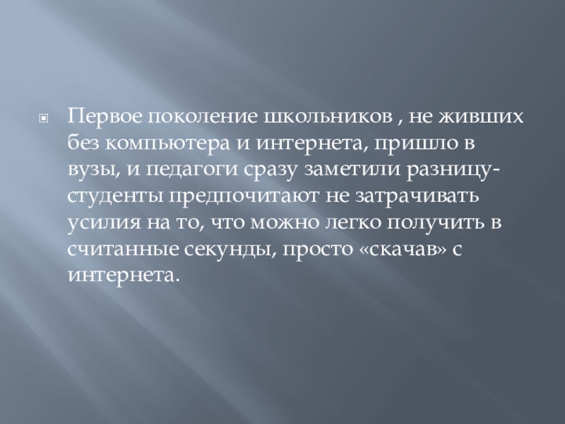 в вузы, и педагоги сразу заметили разницу- студенты предпочитают не затрачивать усилия на то, что можно легко получить в считанные секунды, просто «скачав» с интернета.