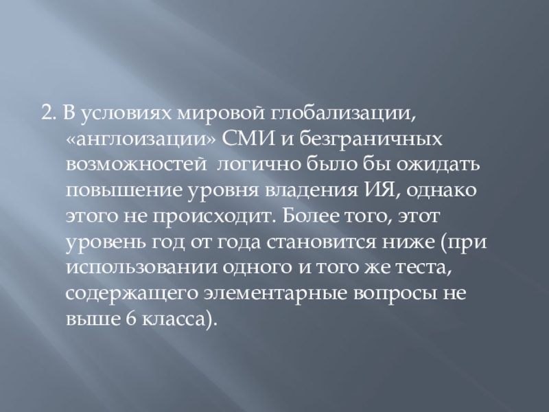 было бы ожидать повышение уровня владения ИЯ, однако этого не происходит. Более того, этот уровень год от года становится ниже (при использовании одного и того же теста, содержащего элементарные вопросы не выше 6 класса).