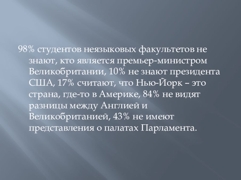 Слайд 598% студентов неязыковых факультетов не знают, кто является премьер-министром Великобритании, 10%