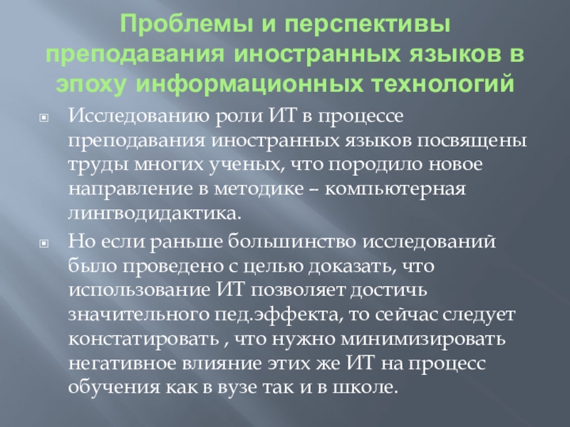 ИТ в процессе преподавания иностранных языков посвящены труды многих ученых, что породило новое направление в методике – компьютерная лингводидактика.