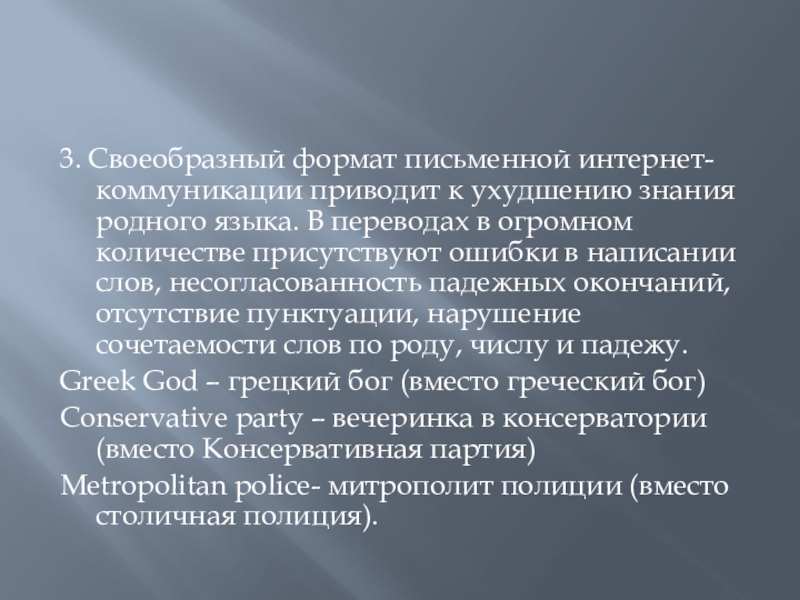 Слайд 73. Своеобразный формат письменной интернет-коммуникации приводит к ухудшению знания родного языка.