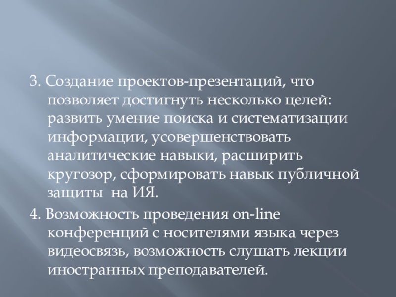 и систематизации информации, усовершенствовать аналитические навыки, расширить кругозор, сформировать навык публичной защиты на ИЯ.
