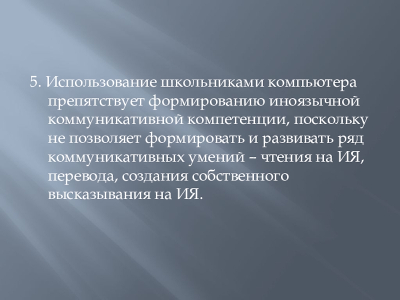 Слайд 95. Использование школьниками компьютера препятствует формированию иноязычной коммуникативной компетенции, поскольку не