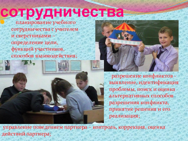 разрешение конфликтов - выявление, идентификация проблемы, поиск и оценка альтернативных способов разрешения конфликта, принятие решения и его реализация;