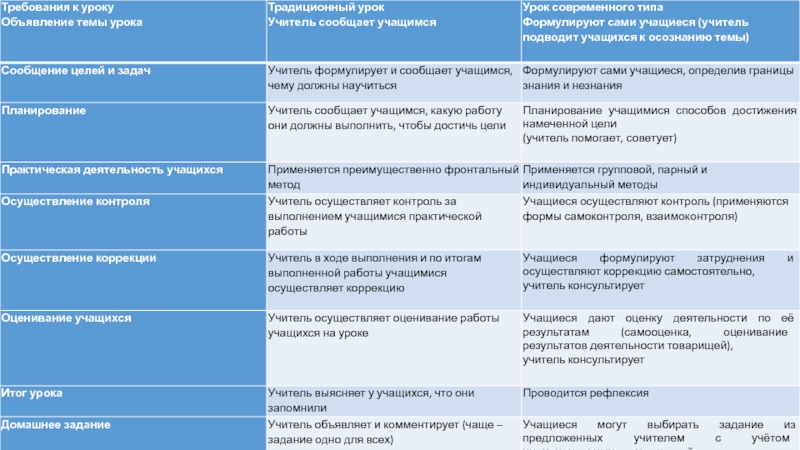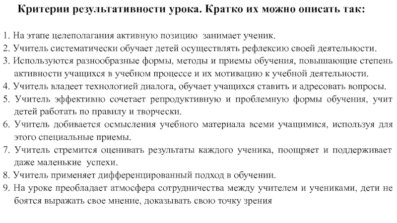 Критерии результативности урока. Кратко их можно описать так:1. На этапе целеполагания активную позицию  занимает ученик.2. Учитель систематически обучает детей осуществлять рефлексию своей деятельности.3. Используются разнообразные формы, методы и приемы обучения, повышающие степень активности учащихся в учебном