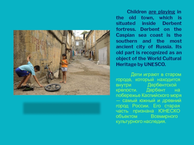 Дети играют в старом городе, который находится внутри Дербентской крепости. Дербент на побережье Каспийского моря — самый южный и древний город России. Его старая часть признана ЮНЕСКО объектом Всемирного культурного наследия.