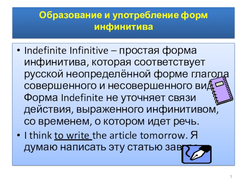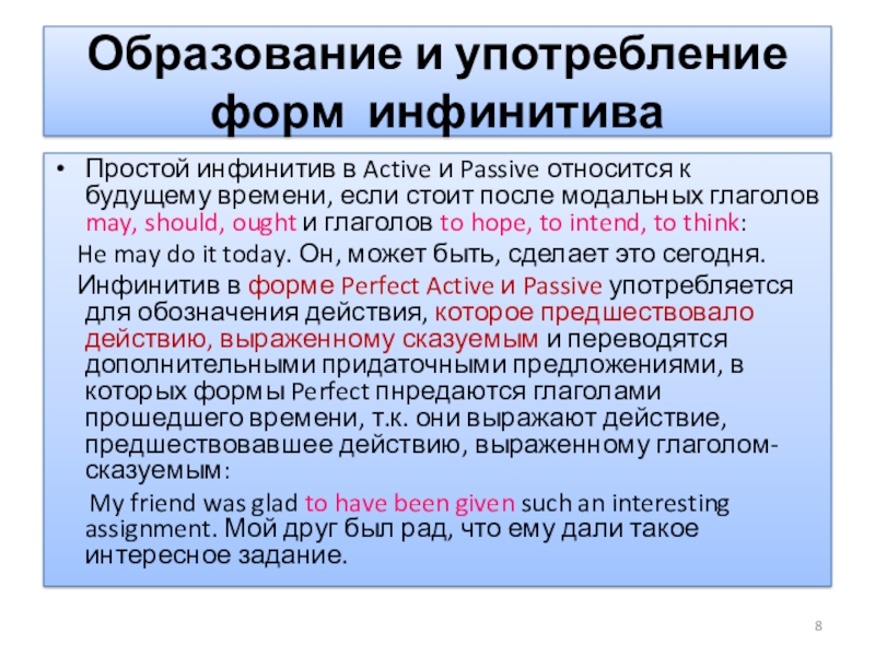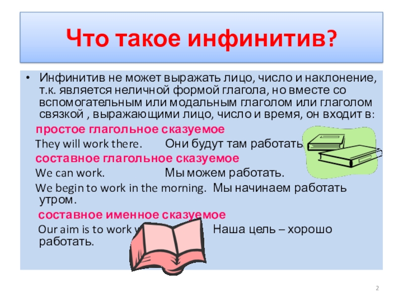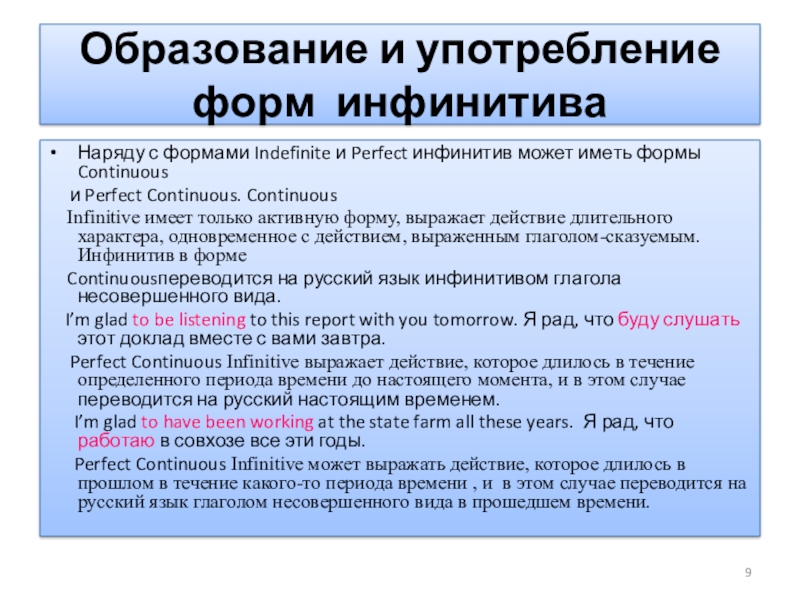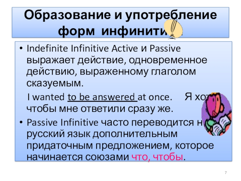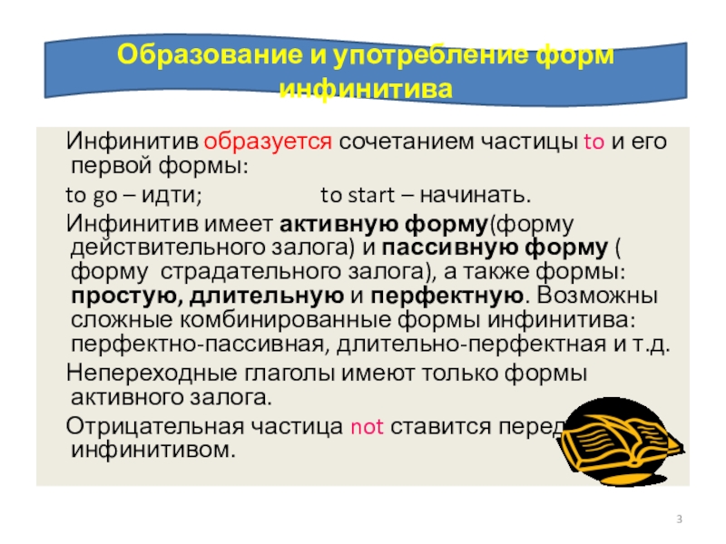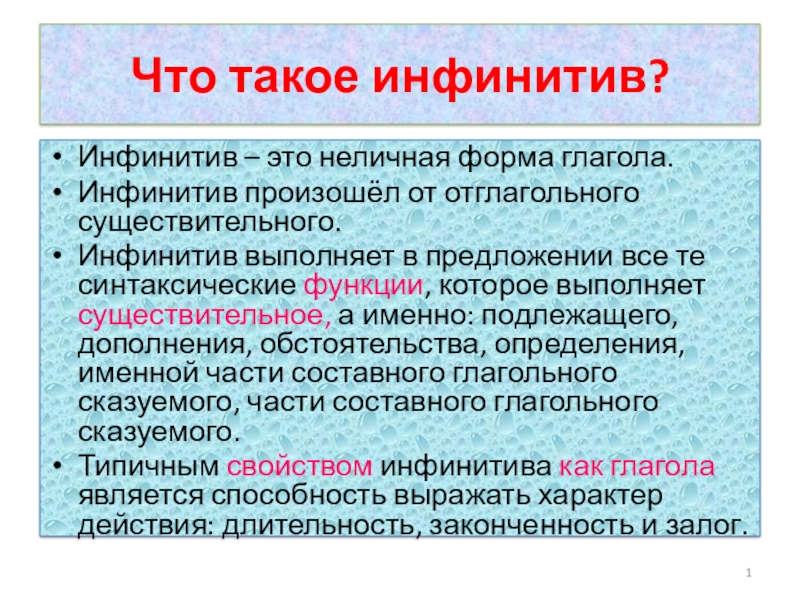 Типичным свойством инфинитива как глагола является способность выражать характер действия: длительность, законченность и залог.