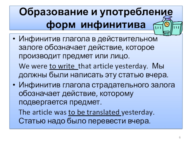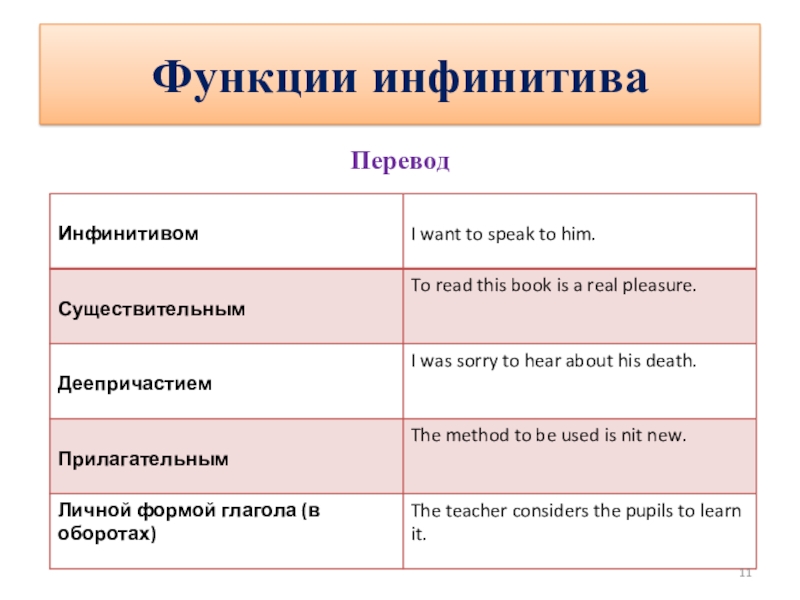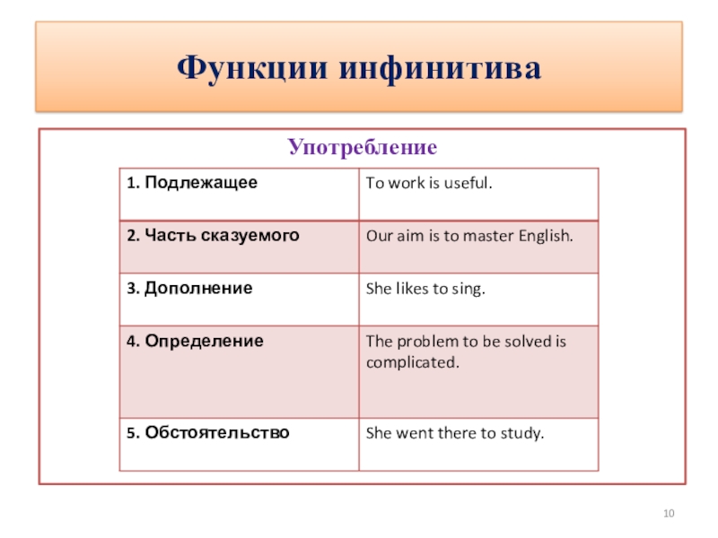 Инфинитив выполняет в предложении все те синтаксические функции, которое выполняет существительное, а именно: подлежащего, дополнения, обстоятельства, определения, именной части составного глагольного сказуемого, части составного глагольного сказуемого.