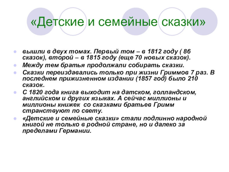 С 1820 года книга выходит на датском, голландском, английском и других языках. А сейчас миллионы и миллионы книжек со сказками братьев Гримм странствуют по свету.